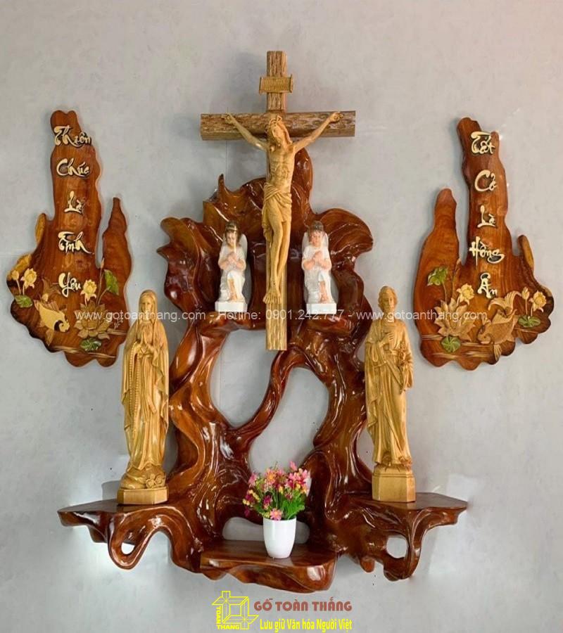 Bàn thờ công giáo nghệ thuật thường được ưa chuộng nhiều nhất bởi những mẫu gốc cây, vì những gốc cây tạo cảm giác tự nhiên, bền vững trường tồn, pha 1 chút nét hoang sơ, giúp không gian bàn thờ của các Tín Hữu thêm phần thân thiện, nhưng không kém phần sang trọng.